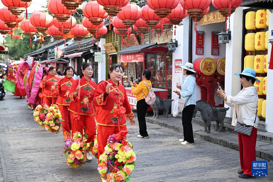 當(dāng)日,在江蘇省高郵市運(yùn)河·盂城驛街區(qū),木偶戲、挑花擔(dān)、撂石鎖等非遺項(xiàng)目表演吸引眾多游人駐足觀看。