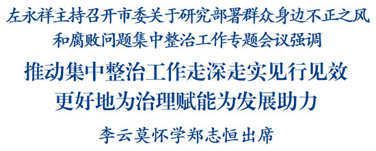 左永祥指出,要壓緊壓實政治責任,構建齊抓共管的工作格局。市級領導要主動擔責、親自研究,各級黨委要切實扛起主責,各級政府要狠抓問題治理解決,各職能部門要按照“管業(yè)務必須強監(jiān)管”要求加強條線工作指導,各級紀委監(jiān)委既要認真履行監(jiān)督專責,又要發(fā)揮牽頭抓總作用,發(fā)動各方面力量形成工作合力。要把深化整治與深入貫徹中央八項規(guī)定精神學習教育結合起來,與整治形式主義為基層減負結合起來,與市委中心工作結合起來,切實把整治成效轉化為高質量發(fā)展實效。