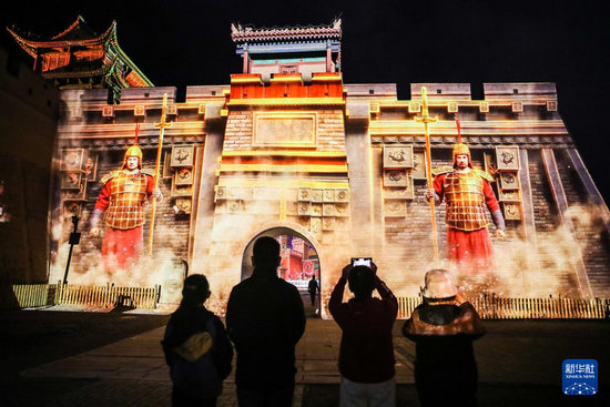 4月26日,游客在嘉峪關(guān)關(guān)城景區(qū)觀看夜游燈光劇《天下嘉峪關(guān)》。