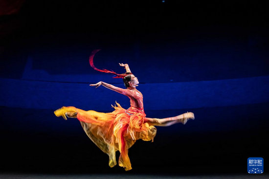 4月28日晚,演員在表演舞蹈史詩劇《詩經(jīng)·格薩爾》。