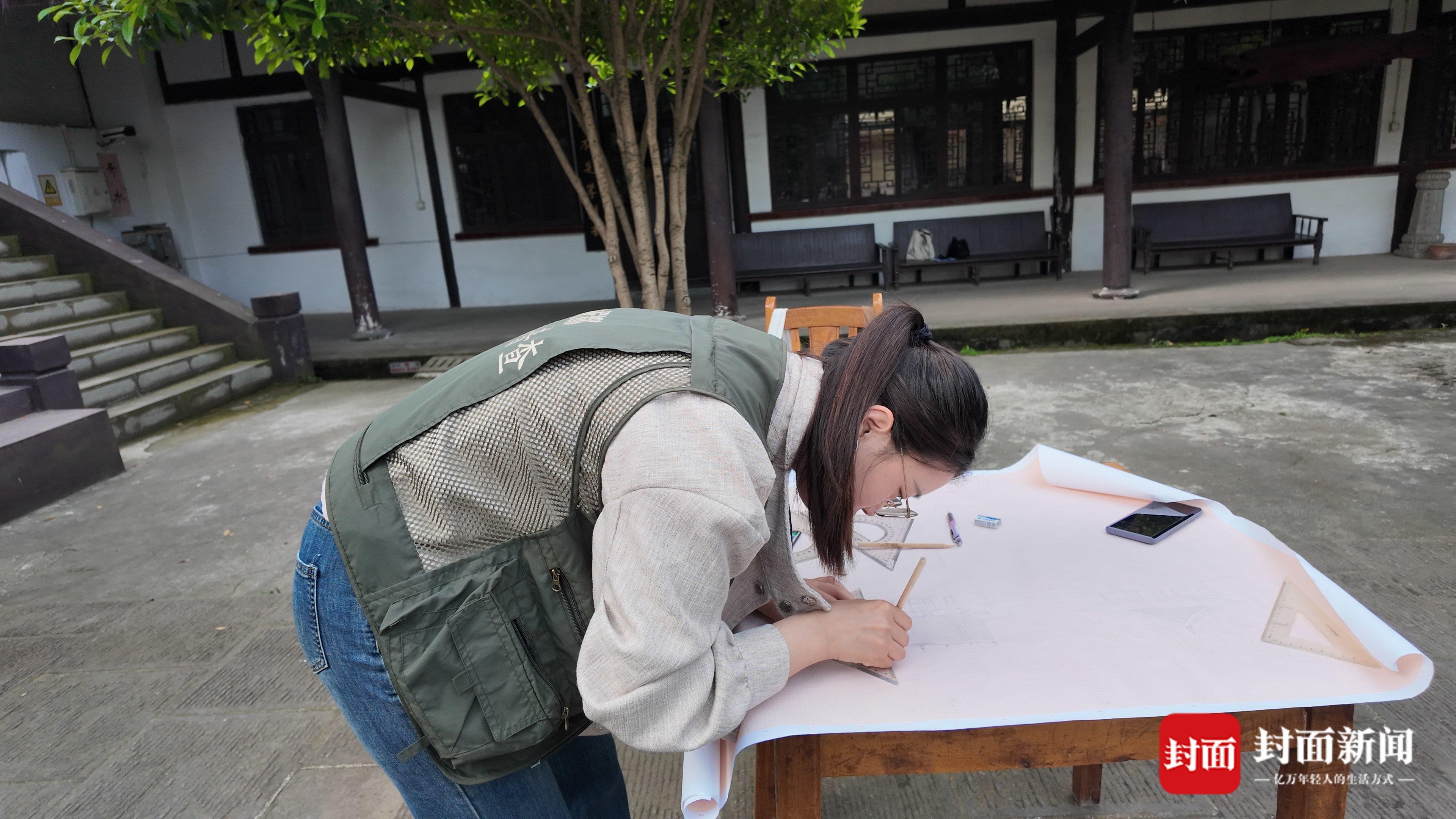 清晨時分,太陽還未直射到古寺內(nèi),在觀音殿前的空地上擺放著一張大桌子,新津區(qū)的文物普查工作者正俯身趴在桌上,用鉛筆細細勾勒出這座古建筑的線圖。清風拂過,繪制紙上的鉛筆沙沙作響,為古寺更添一份靜謐悠然。