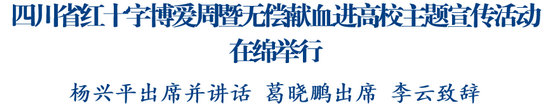 綿陽新聞網(wǎng)訊 5月7日,在第78個(gè)“世界紅十字日”來臨之際,由省紅十字會(huì)、省衛(wèi)生健康委、省教育廳、團(tuán)省委聯(lián)合主辦的四川省紅十字博愛周暨無償獻(xiàn)血進(jìn)高校主題宣傳活動(dòng)在綿舉行。副省長、省紅十字會(huì)會(huì)長楊興平出席講話并看望慰問無償獻(xiàn)血師生,省政府副秘書長葛曉鵬出席,市委副書記、市長李云致辭。