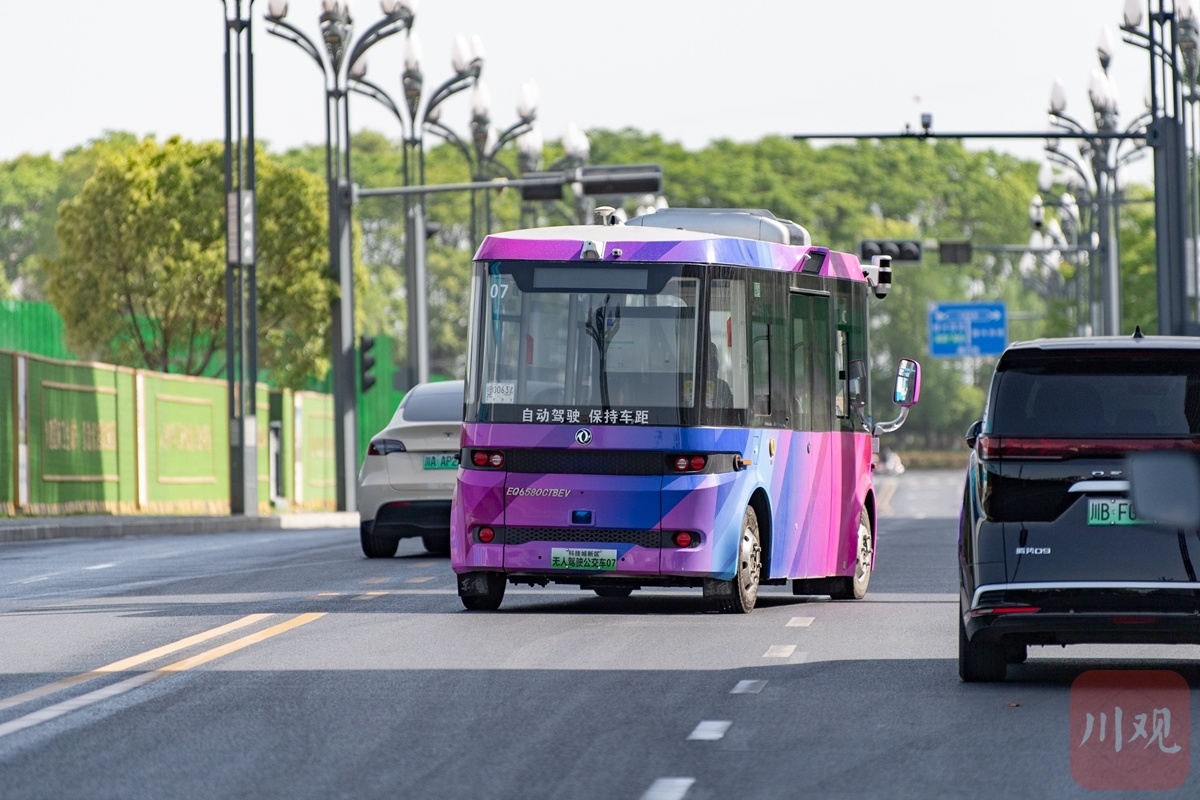 綿陽(yáng)無(wú)人駕駛公交車正在行駛中。攝影/趙明
