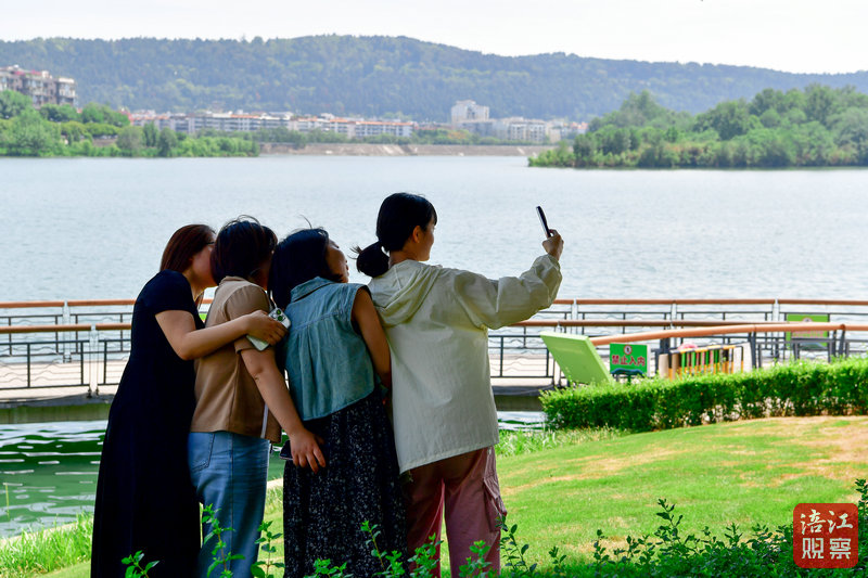 初夏時節(jié)的綿陽,草木繁茂、花香氤氳,位于城市中心的三江湖國家濕地公園,風(fēng)景如畫、天藍水綠、湖光瀲滟,吸引了不少市民和游客在蜿蜒曲折的親水棧道上悠閑漫步,打卡拍照。