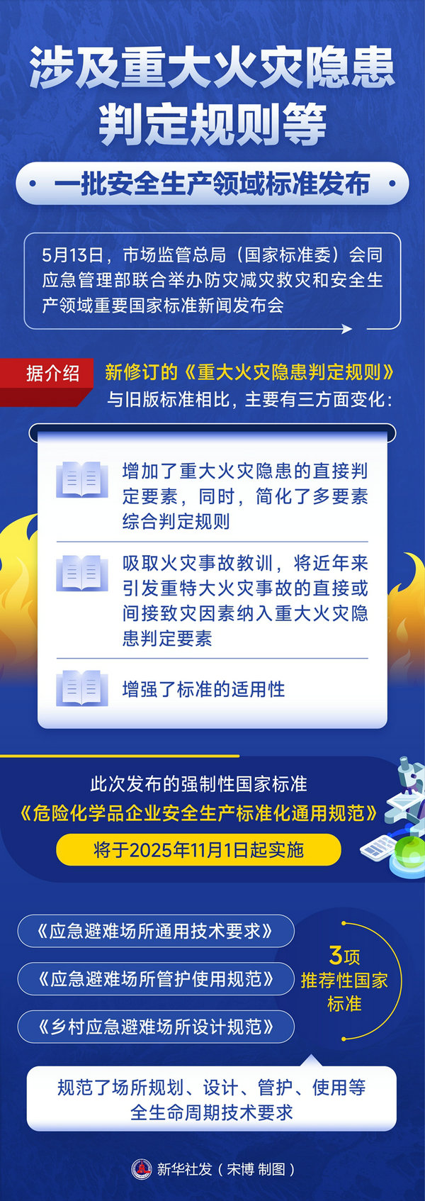 新華社北京5月13日電 題:涉及重大火災隱患判定規(guī)則等 一批安全生產(chǎn)領(lǐng)域標準發(fā)布