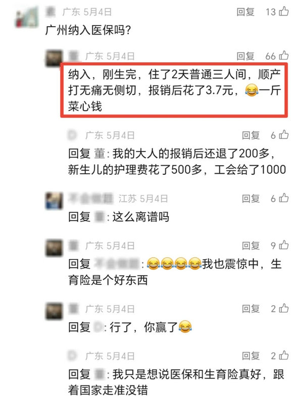 近日,一位廣東網(wǎng)友在國(guó)家醫(yī)保局微信公眾號(hào)評(píng)論區(qū)介紹,自己住院分娩個(gè)人只花了3.7元,引發(fā)大家關(guān)注討論。小編向廣東的同事了解到,這位網(wǎng)友的情況并不是個(gè)例,今年以來(lái),僅在廣州市,就有7000多位寶媽生娃經(jīng)過(guò)生育保險(xiǎn)報(bào)銷后,自己花費(fèi)不到100元,其中,有881人花了不到10元(后附分娩所在醫(yī)療機(jī)構(gòu)名單),甚至還有67人一分錢都沒(méi)花。