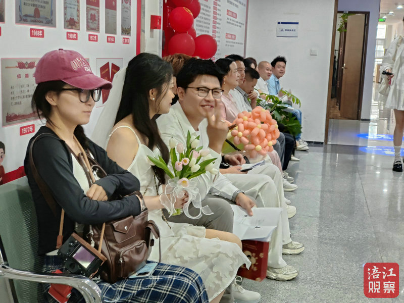 在江油市民政局婚姻登記處,眾多新人手捧鮮花,歡喜地從辦證窗口工作人員手里接過結(jié)婚證書。天氣炎熱,排隊(duì)登記的新人較多,頒證廳空調(diào)全開,工作人員除了熱情服務(wù),還準(zhǔn)備了免費(fèi)的茶水糕點(diǎn)。
