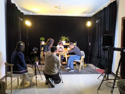 每逢周六,周浚安的攝影棚便熱鬧了起來,團隊成員們從各地趕來拍攝節(jié)目,在這個小小的攝影棚里,他們分工明確、各司其職。其中,有來自土黃中學的老師,有來自四川文理學院的學生……