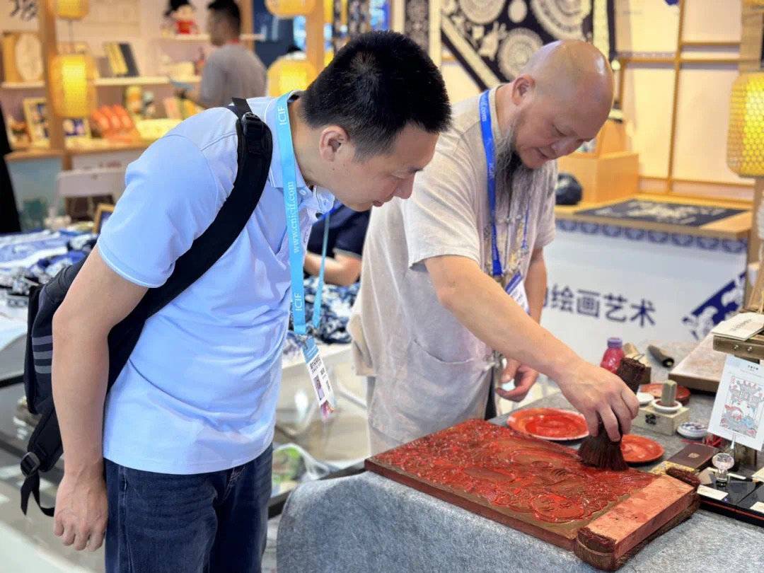 大千紙業(yè)打造的“竹紙+年畫”雙非遺體驗(yàn)場(chǎng)景尤為驚艷。印度游客嘗試木板拓印后連連稱贊,湖北游客試紙后感嘆:“古法手工紙的韌性令人震撼!”這種“可觸摸的非遺”模式,讓傳統(tǒng)文化傳播更具感染力。