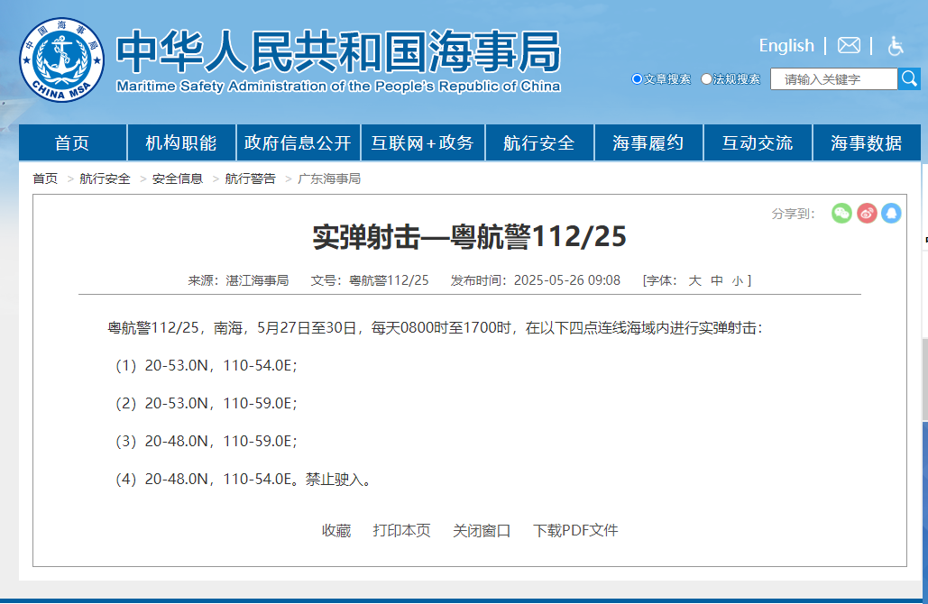 據(jù)中國(guó)海事局網(wǎng)站消息,湛江海事局發(fā)布航行警告,5月27日至30日,每天8時(shí)至17時(shí),南海部分海域進(jìn)行實(shí)彈射擊,禁止駛?cè)搿?/p>