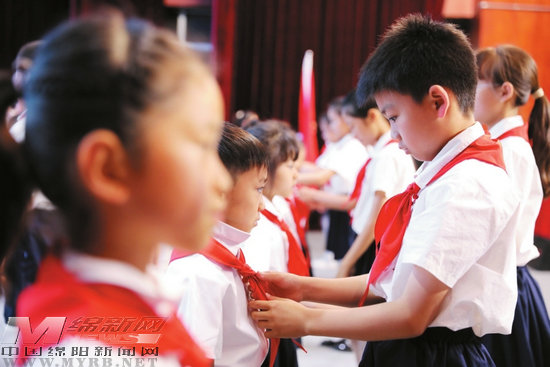 老隊(duì)員為新隊(duì)員佩戴紅領(lǐng)巾