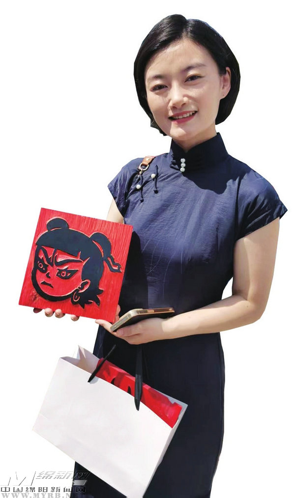 省級(jí)非遺三臺(tái)木刻第5代傳承人楊璟珩展示她和兒子共同創(chuàng)作的木刻作品《哪吒》