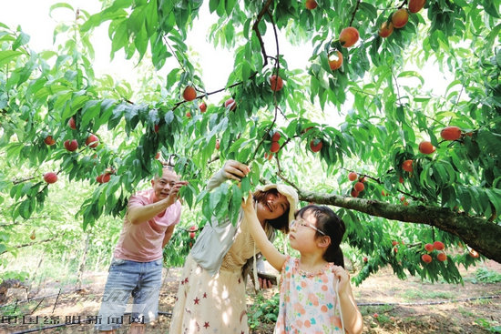 站在山崗俯瞰,全村1100余畝桃林宛如一塊巨大的綠色錦緞,鋪展在丘陵之間,兩旁的桃樹枝丫被果實(shí)壓得很低。“光戰(zhàn)3號(hào)”、五月脆、皮球桃等10余個(gè)品種錯(cuò)峰成熟,紅的似瑪瑙,白的如凝脂,密密麻麻地掛滿枝頭。村民們?nèi)齼蓛傻亟Y(jié)伴采摘,竹筐里的桃子帶著翠綠的枝葉堆成小山。