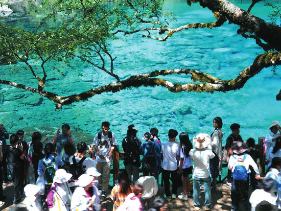 游客在九寨溝景區(qū)游覽。新華社發(fā)