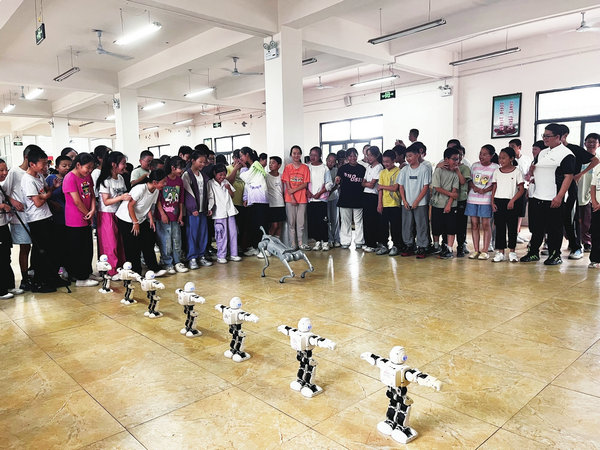 當(dāng)動(dòng)感的音樂(lè)響起,仿生機(jī)器人與機(jī)器狗閃亮登場(chǎng)。機(jī)器人跟著節(jié)奏靈活舞動(dòng),機(jī)器狗時(shí)而扭動(dòng)身軀、時(shí)而跳躍握手,甚至“慵懶”地伸起“腰”,萌態(tài)十足的表演引得孩子們爭(zhēng)相伸手互動(dòng),歡呼聲、驚嘆聲此起彼伏。“以前只在電視上看過(guò)機(jī)器人,今天能近距離接觸,太酷了!”學(xué)生陳鈺軒激動(dòng)地與同伴分享。