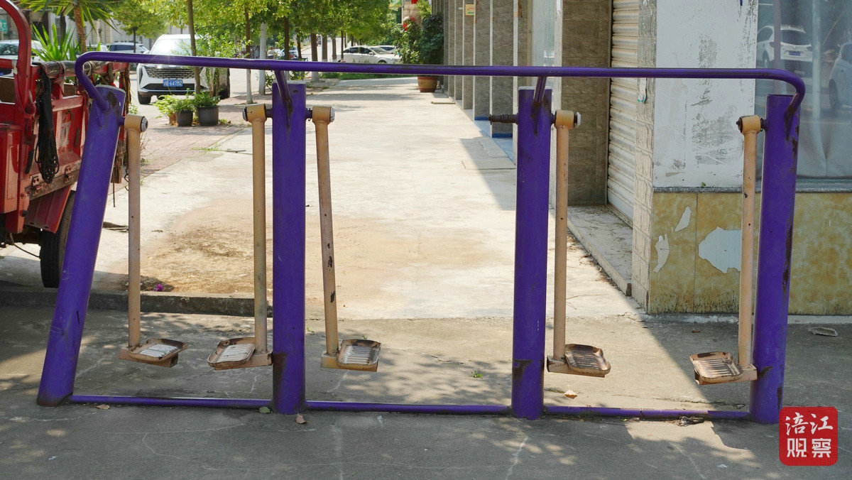 游仙區(qū)利民南路的人行道健身路徑同樣傷痕累累:橢圓機(jī)踏板脫落僅剩支架,雙位秋千只剩鋼架在搖晃。“壞了可能有半年了,還怕把小娃兒傷到。”有市民擔(dān)憂地說(shuō)。