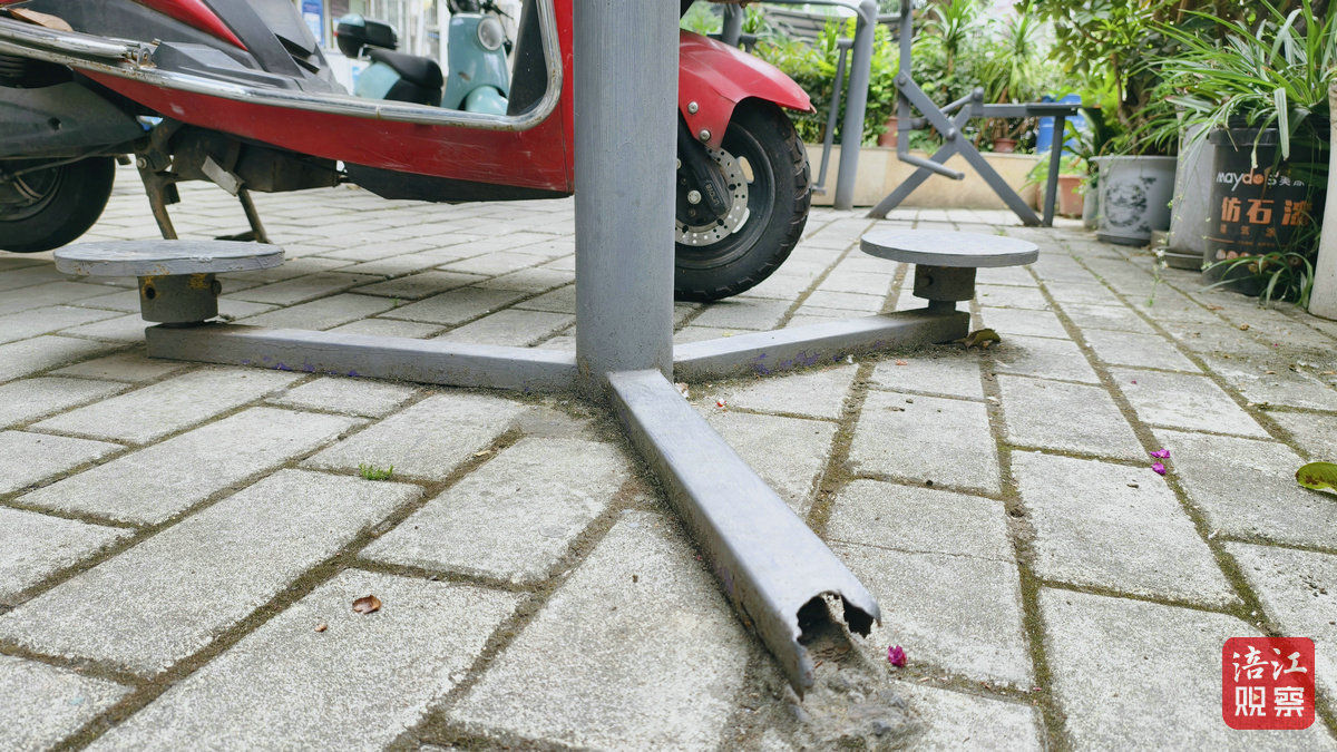 涪城區(qū)瓦店社區(qū)文化廣場(chǎng)的三位扭腰器、太空漫步機(jī)安裝于2015年10月,經(jīng)歷十年風(fēng)雨后,金屬部件銹跡斑斑,部分焊接點(diǎn)斷裂。