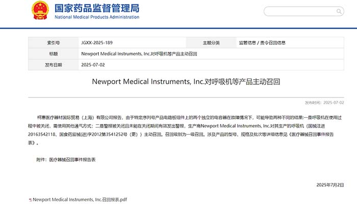 7月2日,國家藥品監(jiān)督管理局發(fā)布通告,柯惠醫(yī)療器材國際貿(mào)易(上海)有限公司報(bào)告,宣布主動(dòng)召回生產(chǎn)商N(yùn)ewport Medical Instruments, Inc.生產(chǎn)的呼吸機(jī)(國械注進(jìn)20163542118、國食藥監(jiān)械(進(jìn))字2012第3541252號(更))。召回級別為一級召回。