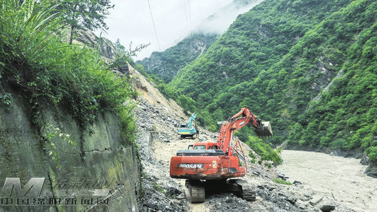 禹茂路K2597+400(石泉堡隧道出口)發(fā)生山體崩塌和路基垮塌,導(dǎo)致該路段交通完全中斷。災(zāi)情發(fā)生后,搶通戰(zhàn)役迅速打響,大型機(jī)械設(shè)備兵分兩路,從禹里、壩底兩個(gè)方向同時(shí)向?yàn)?zāi)害點(diǎn)推進(jìn),開(kāi)展攻堅(jiān)作業(yè),全力搶修臨時(shí)應(yīng)急便道。為確保安全,相關(guān)部門(mén)立即實(shí)施交通管制,由黨員志愿者、公安交警值守引導(dǎo)。