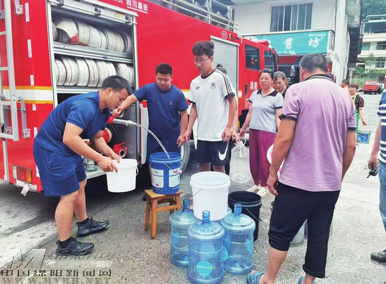 消防車(chē)為平武壩子鄉(xiāng)村民送去生活用水 記者 任露瀟 攝