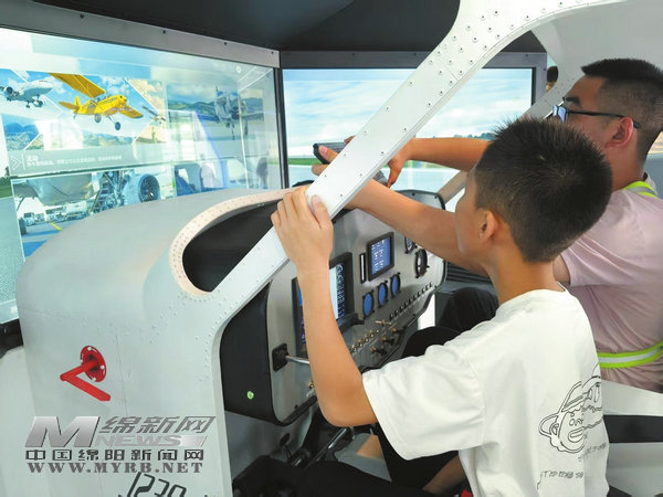 孩子們在北川永昌機(jī)場體驗全真模擬飛行器