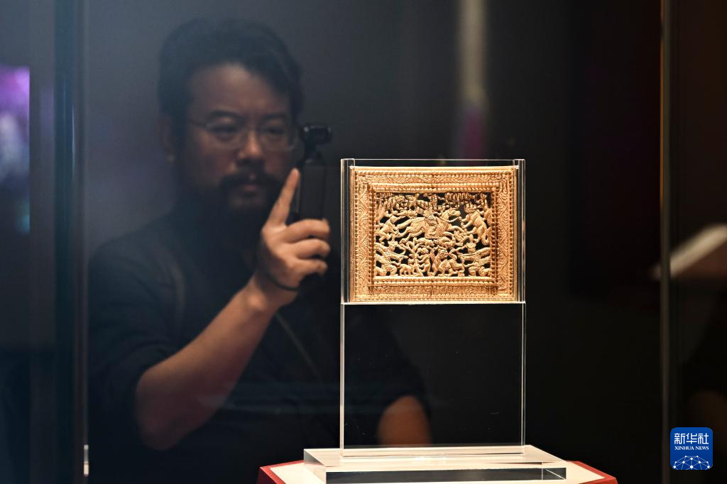 7月8日,媒體人員在“寧夏固原文物精品展”上拍攝展品狩獵圖金方奇。