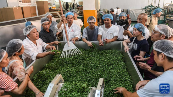 7月11日,制茶匠人在廣西三江縣御香茶業(yè)有限公司生產(chǎn)車間交流六堡茶第一道工序的加工技巧。