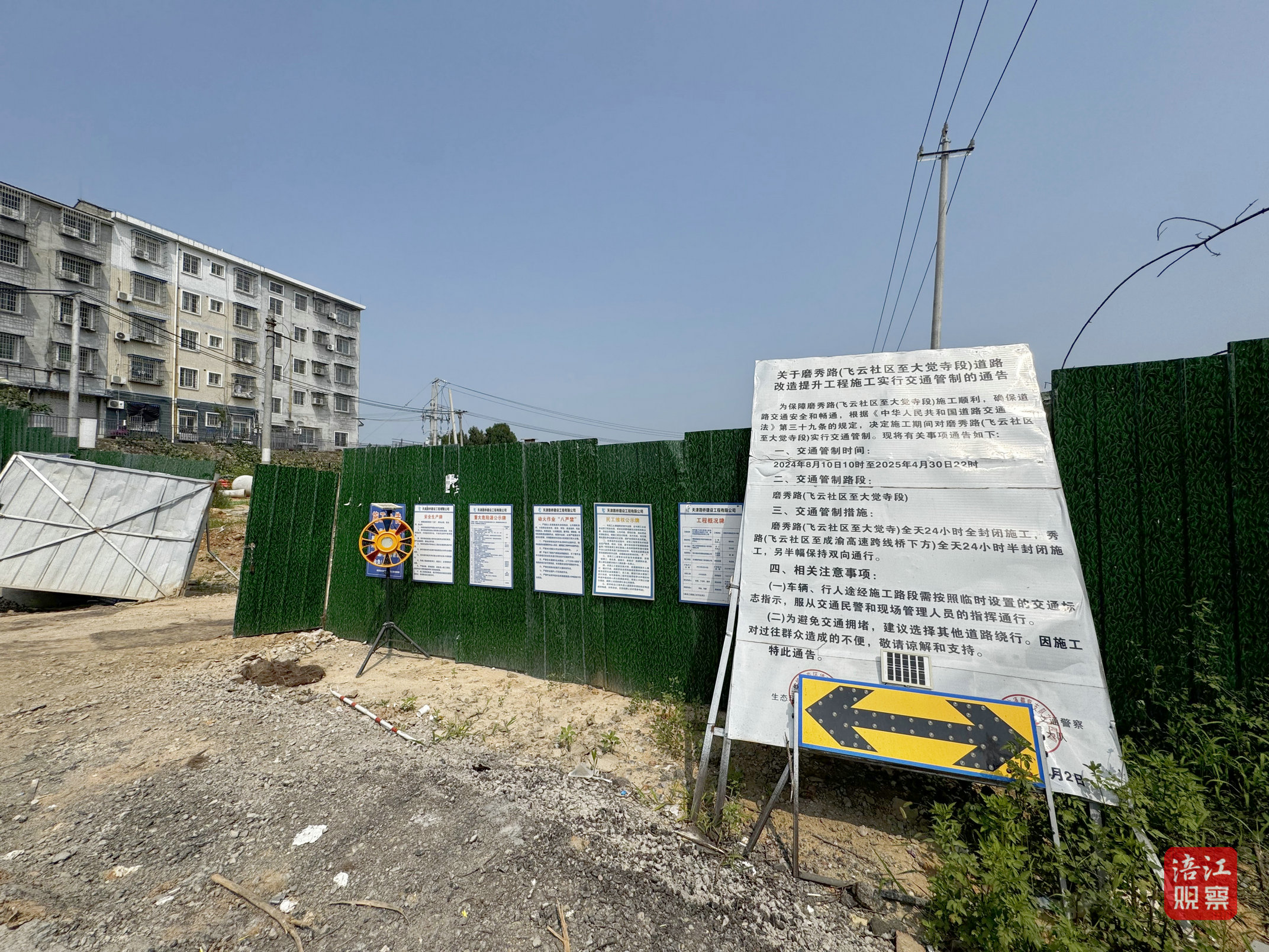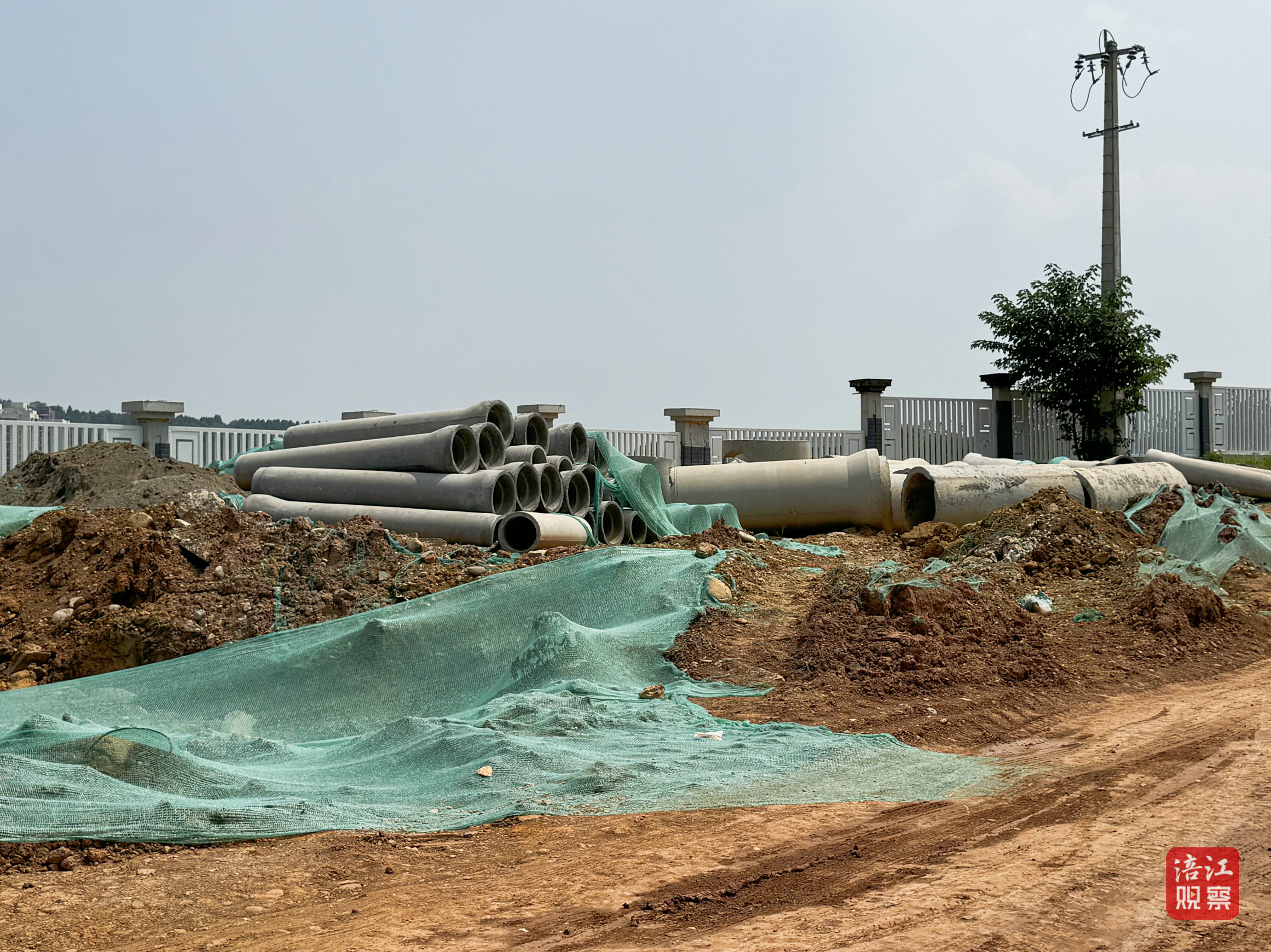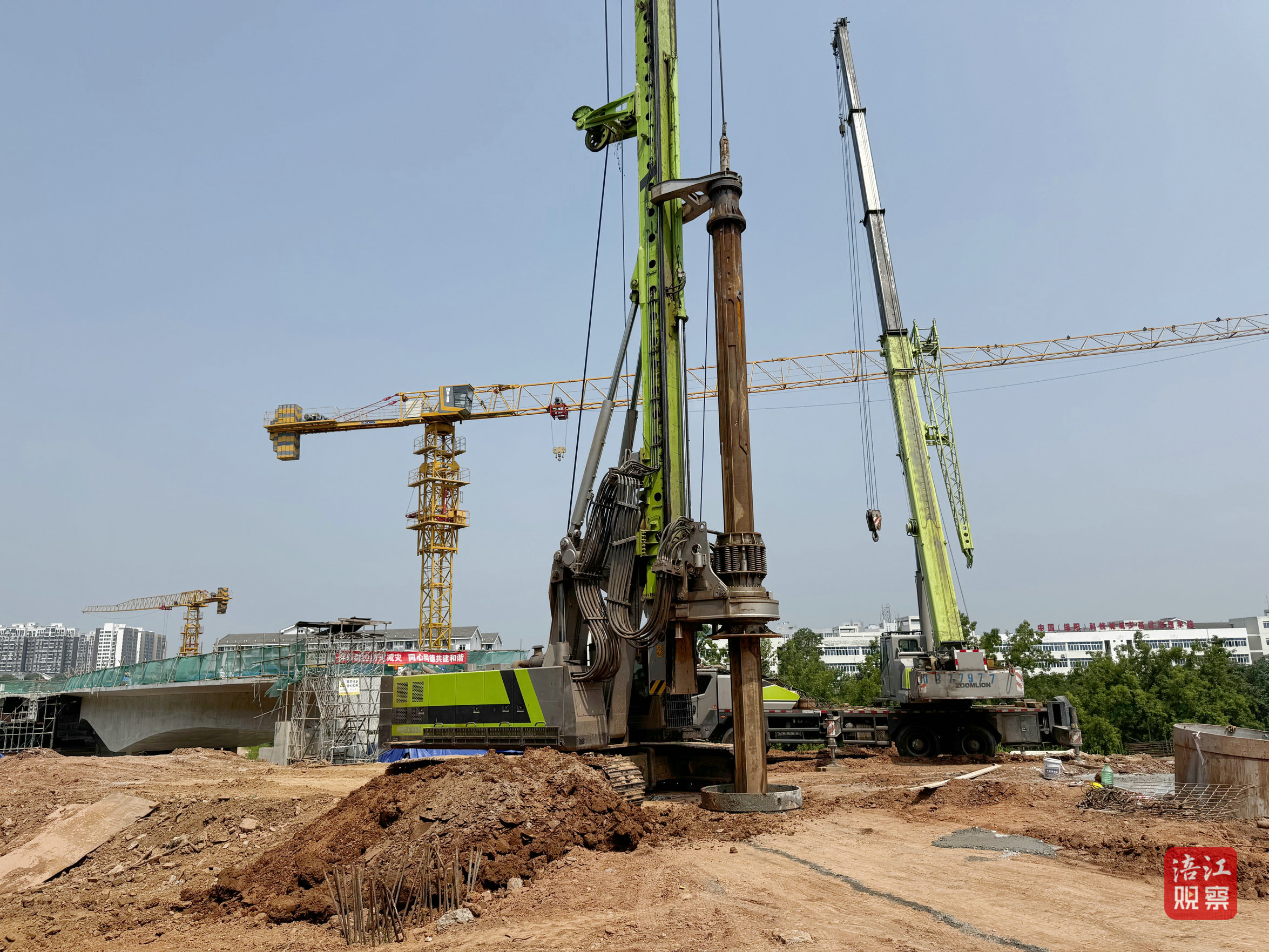7月16日,記者在施工現(xiàn)場(chǎng)看到,圍擋處開了一道門,一條近200米長(zhǎng)的黃土路直通施工區(qū)域,管道等材料隨意堆放在路邊,旋挖機(jī)正在橋梁處轟鳴作業(yè)?,F(xiàn)場(chǎng)的施工公告顯示,該施工項(xiàng)目為磨秀路道路改造提升工程和磨秀路跨草溪河橋梁工程,原計(jì)劃工期為2023年8月至2024年10月,但如今橋梁主體仍未完工,道路也未硬化。