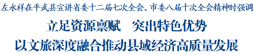 學習宣傳貫徹省委十二屆七次全會、市委八屆十次全會精神,是全市上下當前和今后一個時期的重要政治任務。左永祥認真聽取平武縣推動文旅深度融合發(fā)展情況介紹,并宣講省委十二屆七次全會、市委八屆十次全會精神。他說,推進文化和旅游深度融合發(fā)展,對于增強文化自信、服務人民群眾美好生活、促進高質(zhì)量發(fā)展具有重大意義。平武縣生態(tài)環(huán)境優(yōu)美、文旅資源富集,推進文旅融合發(fā)展有基礎、有條件、有潛力。要把省委、市委全會各項部署要求轉化為實實在在的舉措,把推進文化和旅游深度融合發(fā)展擺在更加突出的位置,進一步增強緊迫感,搶抓發(fā)展機遇、持續(xù)對標補短,用好優(yōu)質(zhì)自然生態(tài)資源和特色優(yōu)勢資源,找準定位、理清思路,走好差異化發(fā)展路子,扎實推進重點文旅項目建設,優(yōu)化“吃住行游購娛”一站式服務,加快把文化旅游業(yè)打造成為支柱產(chǎn)業(yè)、民生產(chǎn)業(yè)、幸福產(chǎn)業(yè)。要把學習貫徹省委、市委全會精神與做好當前工作結合起來,統(tǒng)籌做好抓項目、擴投資、促消費、惠民生、保安全等重點工作,堅定不移實現(xiàn)全年經(jīng)濟社會發(fā)展目標,為全市發(fā)展大局作出應有貢獻。