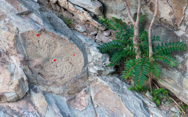 這是7月23日在賀蘭山巖畫景區(qū)拍攝的巖畫和紅色標識點(無人機照片)。標識點方便游客找到巖畫,可以隨時粘貼,對石質和文物不會產生影響。
