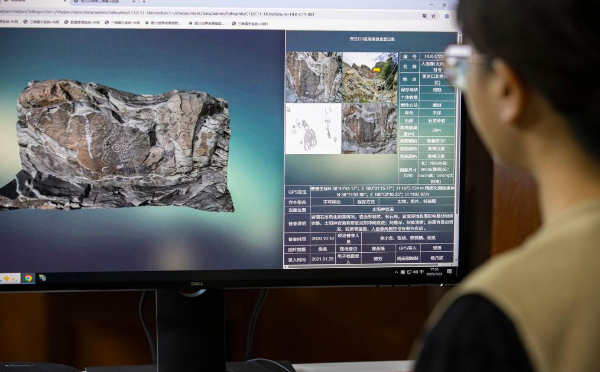 這是7月23日拍攝的賀蘭山巖畫多源數(shù)據管理平臺。工作人員將賀蘭口的形態(tài)和其中的巖畫進行高精度掃描和建模,通過電腦便可查看賀蘭口的整體情況和個體巖畫樣貌。