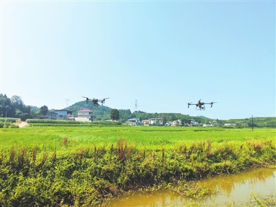 金石鎮(zhèn)種植大戶用無人機(jī)對泰優(yōu)粵禾絲苗秧苗進(jìn)行植保