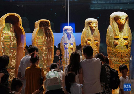 8月11日晚,觀眾在上海博物館展廳內(nèi)參觀“金字塔之巔:古埃及文明大展”。