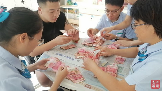 工作人員嚴(yán)格按照規(guī)定專業(yè)耐心地進(jìn)行剝離、清理、核對,避免造成二次損毀并確保每張紙幣的防偽特征與殘損程度鑒定精準(zhǔn)。經(jīng)過近2小時清點(diǎn),成功為客戶兌換1.8萬元,挽回了近90%的損失。