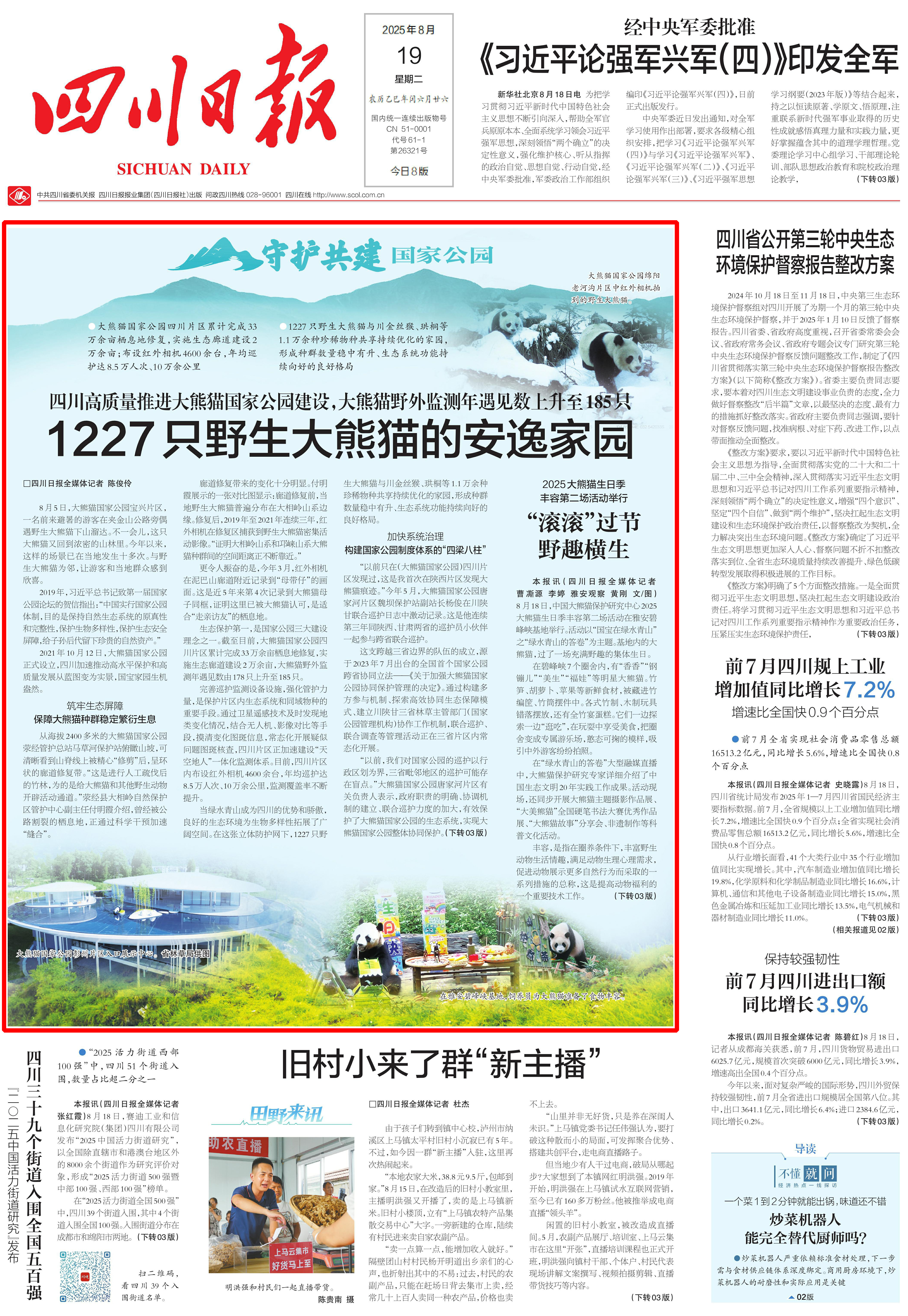8月19日,《四川日?qǐng)?bào)》頭版頭條刊發(fā)文章《四川高質(zhì)量推進(jìn)大熊貓國(guó)家公園建設(shè),大熊貓野外監(jiān)測(cè)年遇見數(shù)上升至185只 1227只野生大熊貓的安逸家園》,其中特別關(guān)注了大熊貓國(guó)家公園綿陽片區(qū),點(diǎn)贊平武縣將蜜蜂當(dāng)作綠水青山化作金山銀山的轉(zhuǎn)化器,生態(tài)保護(hù)與社區(qū)發(fā)展實(shí)現(xiàn)雙贏。