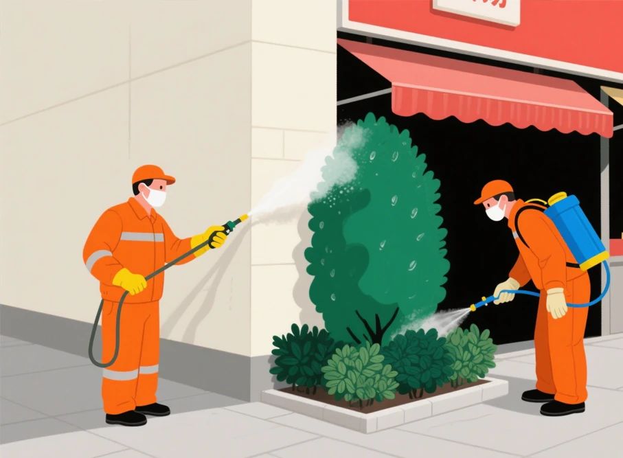 市場(chǎng)周邊綠化帶實(shí)施滯留噴灑,重點(diǎn)處理墻面、墻角及檔口下部陰暗處。綠化植被噴灑至2米以下高度,確保葉片背面均勻覆蓋藥液,每月至少處理一次。