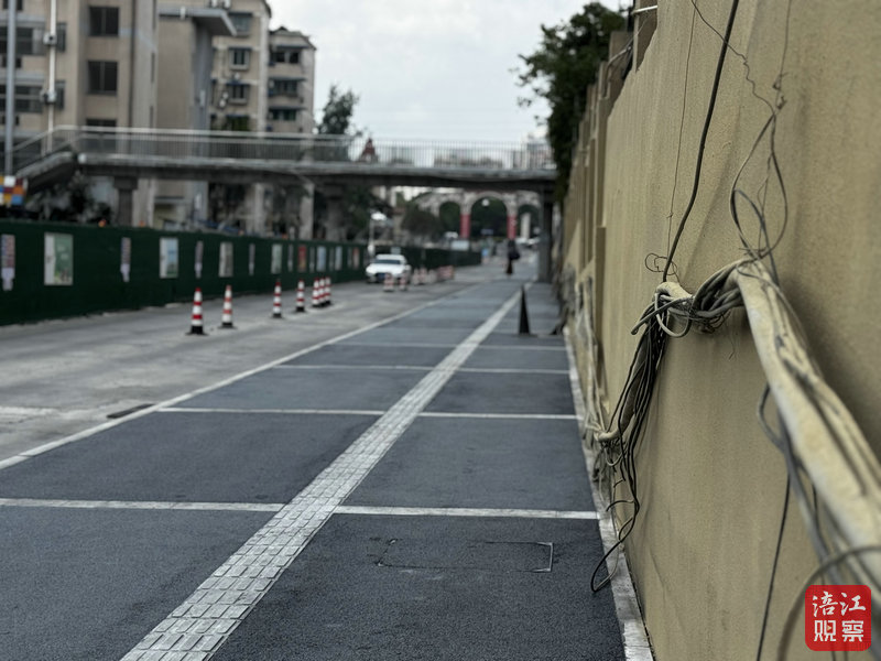 8月19日下午,記者來到施工現(xiàn)場看到,機(jī)動車道正在進(jìn)行半幅施工,人行道區(qū)域已鋪設(shè)平整,煥然一新。然而,靠近外國語學(xué)校一側(cè)的墻面上,粗細(xì)不一、顏色各異的線纜或懸掛于墻、或成卷垂落在地,顯得十分凌亂。