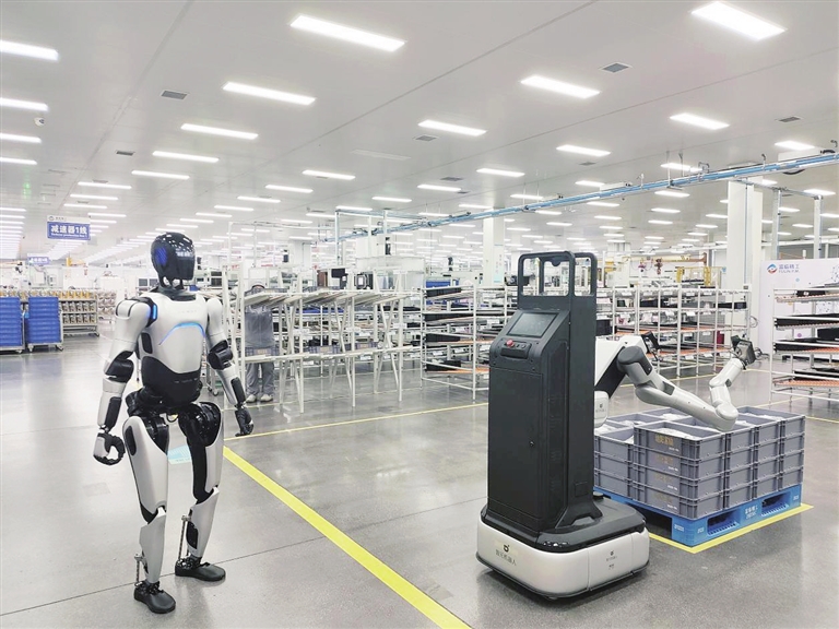 富臨精工股份有限公司生產(chǎn)車間內(nèi),一臺身高近170厘米的黑銀配色類人型機(jī)器人正自主完成料箱搬運、貨物裝卸等任務(wù),并與工人無縫協(xié)同。 受訪者供圖