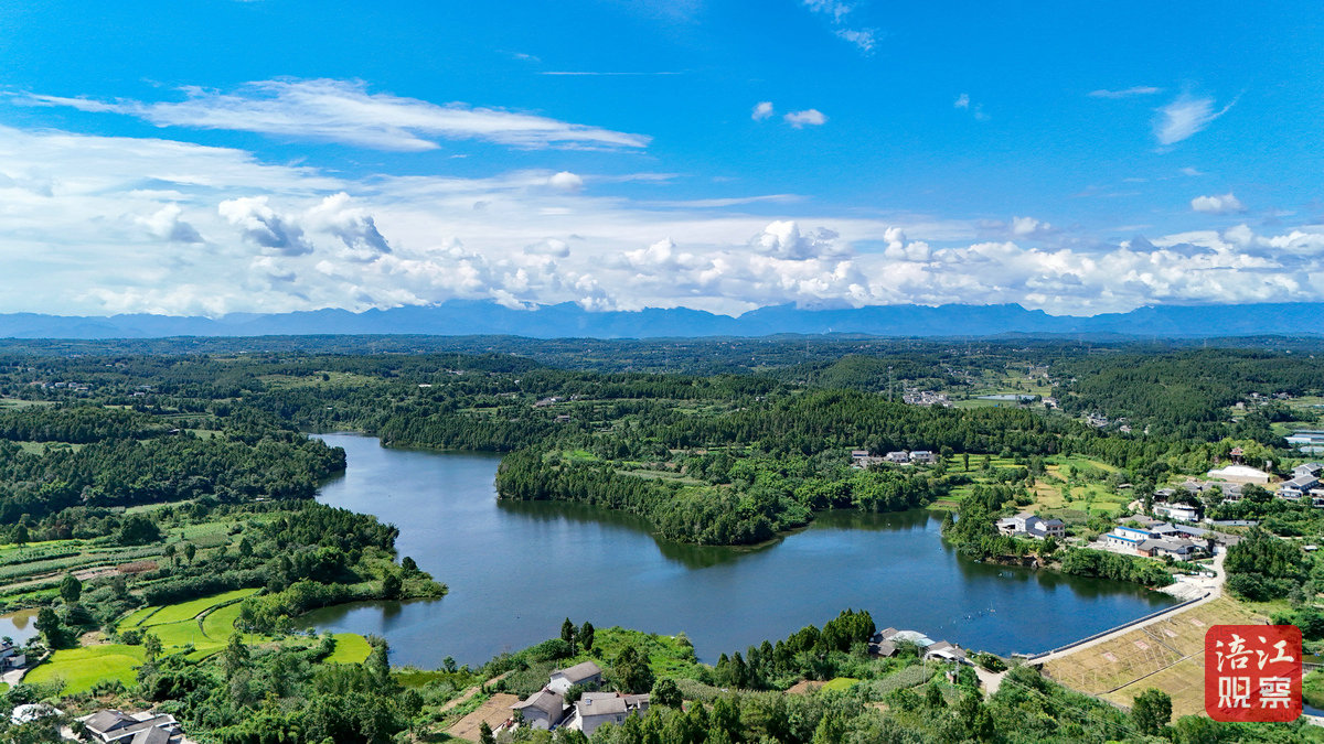 黃綠交織的田野間,農(nóng)房鱗次櫛比,道路如玉帶蜿蜒,水庫(kù)似碧玉鑲嵌在大地,盡顯寧?kù)o與祥和。