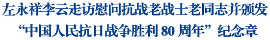 綿陽新聞網訊 今年是中國人民抗日戰(zhàn)爭暨世界反法西斯戰(zhàn)爭勝利80周年。近日,省委常委、市委書記左永祥,市委副書記、市長李云走訪慰問抗戰(zhàn)老戰(zhàn)士、老同志,并頒發(fā)“中國人民抗日戰(zhàn)爭勝利80周年”紀念章,代表市委、市政府向全市抗戰(zhàn)老戰(zhàn)士、老同志致以崇高敬意和誠摯問候。