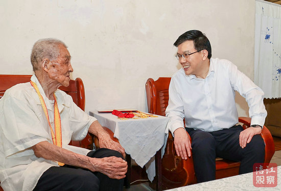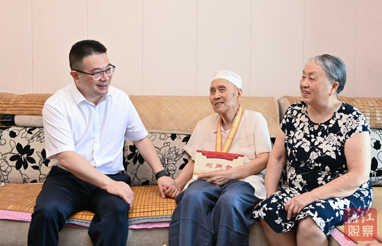 102歲的老戰(zhàn)士張登仁曾參加過抗日戰(zhàn)爭。左永祥來到張登仁家中,為他頒發(fā)“中國人民抗日戰(zhàn)爭勝利80周年”紀念章,并與老人促膝交談,關切詢問其身體狀況和生活情況,感謝他為民族獨立、人民解放事業(yè)作出的積極貢獻,希望他保重身體,祝福他健康長壽。左永祥說,習近平總書記對老戰(zhàn)士、老同志十分牽掛,黨中央、國務院、中央軍委就頒發(fā)“中國人民抗日戰(zhàn)爭勝利80周年”紀念章作出部署,充分體現(xiàn)了以習近平同志為核心的黨中央對抗戰(zhàn)老戰(zhàn)士、老同志的高度重視和深切關懷。我們要大力弘揚偉大抗戰(zhàn)精神,走好我們這一代人的長征路,勇于戰(zhàn)勝前進道路上的各種風險挑戰(zhàn),弘揚新風正氣,奮力拼搏進取,廣泛凝聚起為綿陽高質量發(fā)展團結奮斗的強大力量。要牢記革命先輩的豐功偉績,大力宣傳他們的英雄事跡,傳承發(fā)揚他們的斗爭精神,教育引導好下一代,讓紅色基因、革命薪火代代傳承。要關心照顧好老戰(zhàn)士老同志,用心用情用力做好服務保障工作,讓他們充分感受到黨的溫暖、更好享受到改革發(fā)展成果,安享幸福晚年。