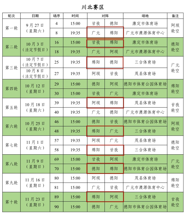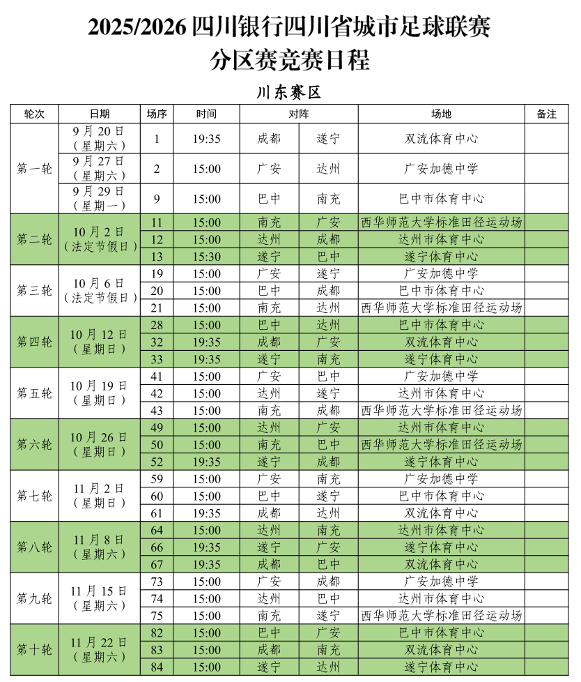綿陽新聞網(wǎng)訊 9月11日,四川省足球協(xié)會(huì)正式公布2025/2026四川銀行四川省城市足球聯(lián)賽(簡稱“川超”)分區(qū)賽階段競賽日程。9月20日19:35,“川超”揭幕戰(zhàn)將在成都雙流體育中心打響,成都隊(duì)坐鎮(zhèn)主場迎戰(zhàn)遂寧隊(duì)。位于川北賽區(qū)的綿陽隊(duì),將在9月27日第一輪亮相,客場對戰(zhàn)廣元隊(duì)。