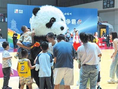 “哇,快看,好大一只大熊貓!”比賽尚未開(kāi)始,伴隨拉拉隊(duì)熱場(chǎng)舞蹈的火熱開(kāi)場(chǎng),一只巨大的“大熊貓”也從場(chǎng)邊蹦蹦跳跳地走向球場(chǎng)。這只高近3米的“大熊貓”像是從漫畫里蹦出來(lái)的,圓滾滾的肚子隨著步伐輕輕晃動(dòng),連走路姿勢(shì)都不自覺(jué)地變成了“熊貓搖擺”。別看它體型龐大,活動(dòng)起來(lái)卻相當(dāng)靈活,不僅可以隨著音樂(lè)的節(jié)奏擺出各種造型,還走向觀眾席張開(kāi)雙臂主動(dòng)向大家求抱抱,吸引了不少球迷上前圍觀合影。到了中場(chǎng)休息環(huán)節(jié),家長(zhǎng)們更是帶著孩子將“大熊貓”團(tuán)團(tuán)圍住,現(xiàn)場(chǎng)氣氛十分有趣。