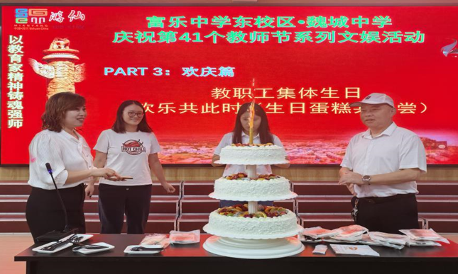 在教職工集體生日環(huán)節(jié),該校工會為大家準備了鮮花和精美禮物,老師們齊唱生日歌,共享生日蛋糕,將慶?;顒油葡蛄烁叱薄?/p>