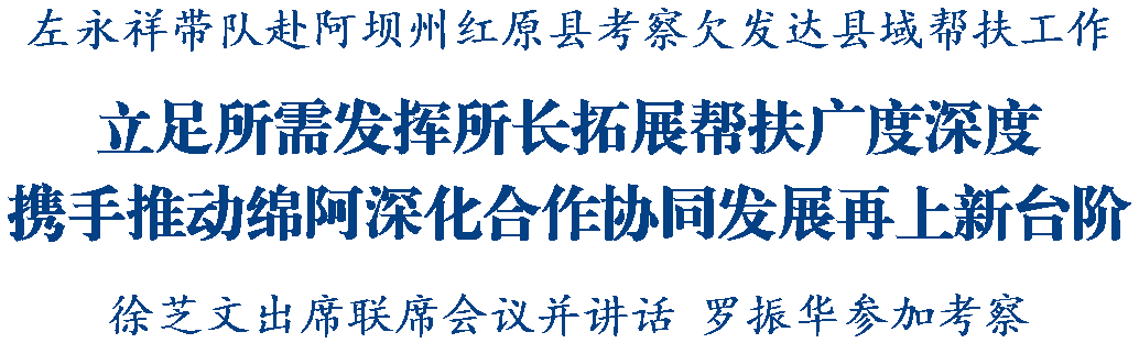 綿陽(yáng)新聞網(wǎng)訊 9月15日至16日,省委常委、市委書(shū)記左永祥帶隊(duì)赴阿壩州紅原縣考察欠發(fā)達(dá)縣域幫扶工作,看望慰問(wèn)我市結(jié)對(duì)幫扶干部人才代表,出席綿陽(yáng)市結(jié)對(duì)幫扶阿壩州紅原縣、壤塘縣聯(lián)席會(huì)議并講話。副省長(zhǎng)、阿壩州委書(shū)記徐芝文出席聯(lián)席會(huì)議并講話。