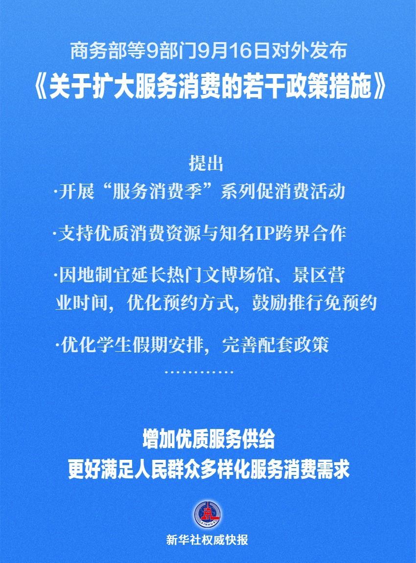 商務部等9部門9月16日對外發(fā)布《關于擴大服務消費的若干政策措施》,提出五方面19條舉措,包括: