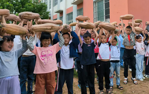 該校校園種植園里,金燦燦的南瓜、胖乎乎的冬瓜、沉甸甸地掛滿藤蔓,綠油油的空心菜在陽(yáng)光下閃耀著收獲的喜悅。
