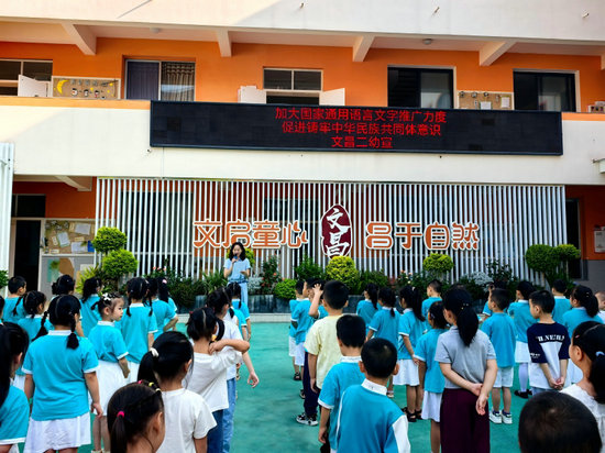 推普周開(kāi)幕式上,黨支部書(shū)記、園長(zhǎng)白莉萍結(jié)合生動(dòng)實(shí)例,強(qiáng)調(diào)普通話在日常生活與文化傳承中的重要意義,鼓勵(lì)師生積極使用普通話,傳承中華優(yōu)秀語(yǔ)言文化。大班幼兒代表在國(guó)旗下用清脆而堅(jiān)定的普通話發(fā)出倡議:“我們要從小講好普通話,爭(zhēng)做文明溝通的小使者!”鏗鏘童言激發(fā)了全園參與推普的熱情。