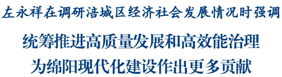 9月24日,省委常委、市委書記左永祥調(diào)研涪城區(qū)經(jīng)濟(jì)社會發(fā)展情況。他強(qiáng)調(diào),要深入學(xué)習(xí)貫徹習(xí)近平總書記對四川工作系列重要指示精神,全面落實黨中央、國務(wù)院和省委、省政府部署要求,錨定“走在前、挑大梁”,統(tǒng)籌推進(jìn)高質(zhì)量發(fā)展和高效能治理,為綿陽現(xiàn)代化建設(shè)作出更多貢獻(xiàn)。