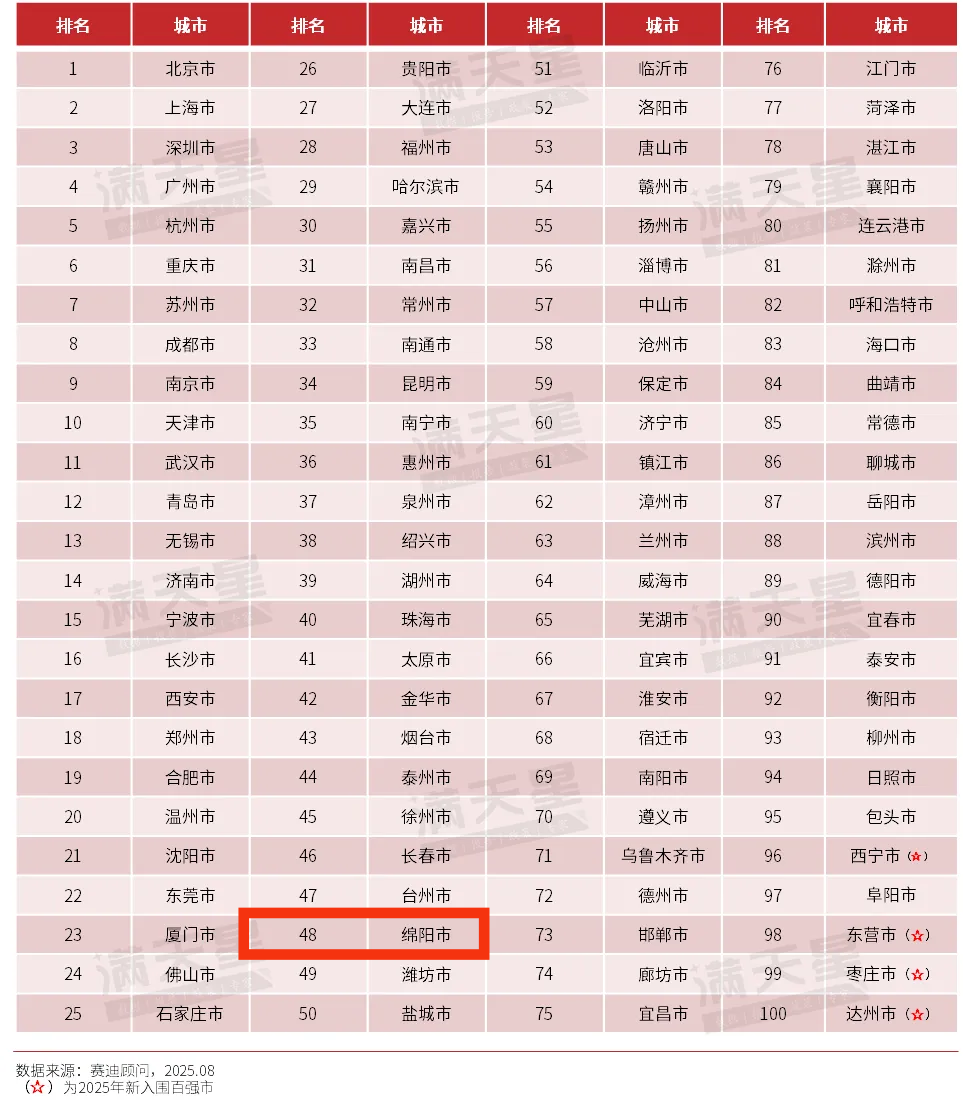 9月25日,賽迪顧問發(fā)布《2025年中國(guó)數(shù)字城市競(jìng)爭(zhēng)力研究報(bào)告》,2025年數(shù)字百?gòu)?qiáng)市名單出爐,綿陽(yáng)位列第48位,較2024年上升2位,位居全省第2,僅次于成都。